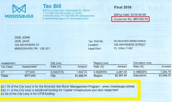 Are there special programs or project costs council wants to highlight? Separating an infrastructure levy from the operating levy on the tax bill can be an effective way to highlight costs. The City of Mississauga’s bill identifies three such levies for the City of Mississauga highlights three special levies: The Emerald Ash Borer Management Program (a tree pest), Capital Infrastructure and Debt Repayment and the University of Toronto Mississauga Campus.