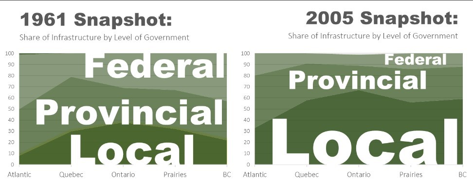 Why the increasing focus on capital? Local governments own most of the public infrastructure in Canada now – that means covering lifecycle costs, asset management, preventative maintenance and more. Try using this graphic depicting the transfer of assets to local governments to illuminate newer financial responsibilities.