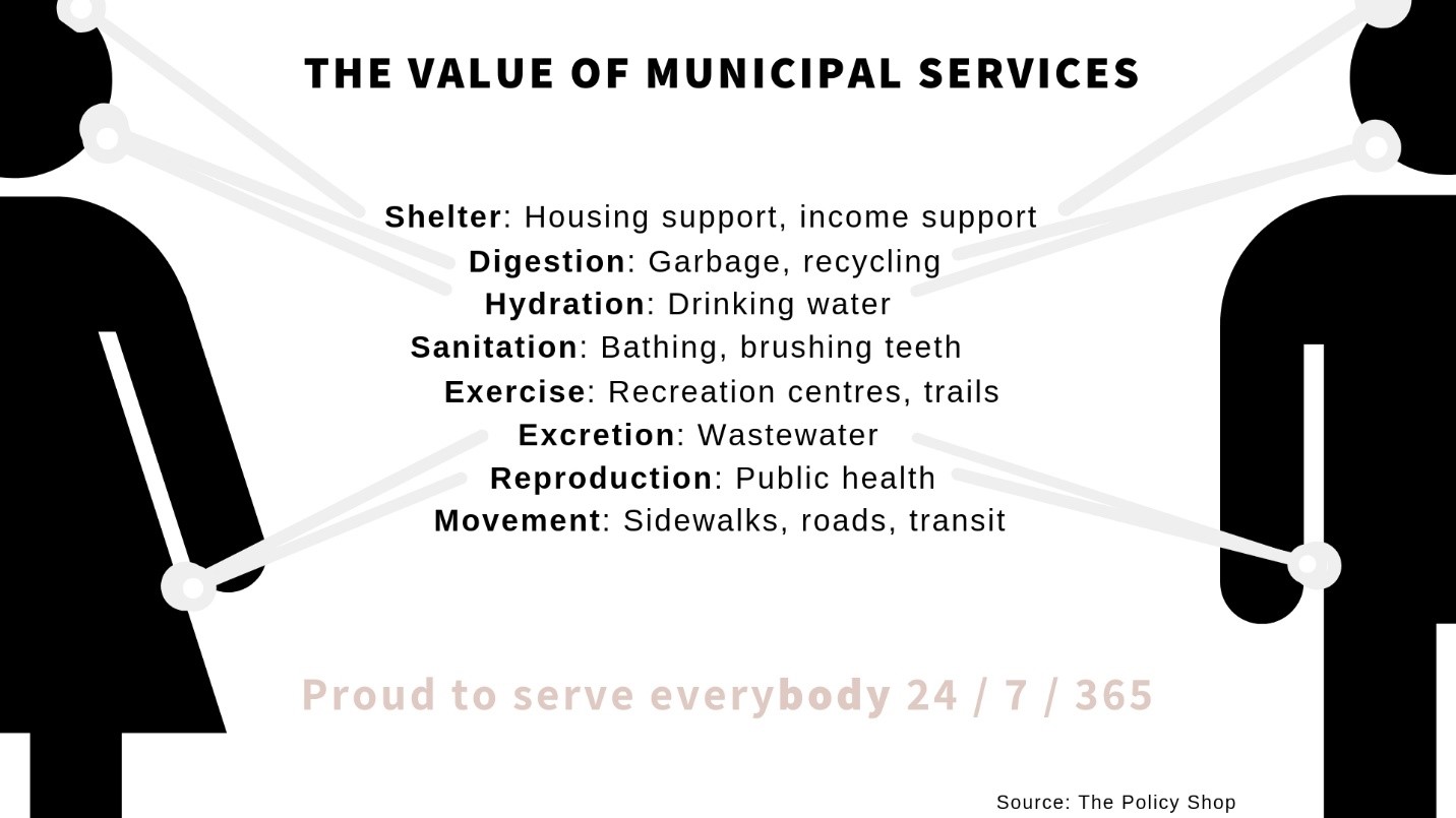 Tired of comparing the cost of services to the cost of a cup of coffee to communicate that municipal services are good value for money? Try this instead: The services we provide are important because they support everyone’s bodily functions. Every shower, flush, cereal box and bike ride involves local services.